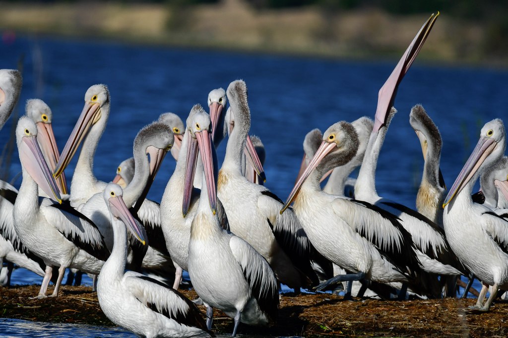 Pelicans often feed in large groups. Circling and herding fish into shallow waters, where they synchronise dipping their bills into the water for maximum catch.