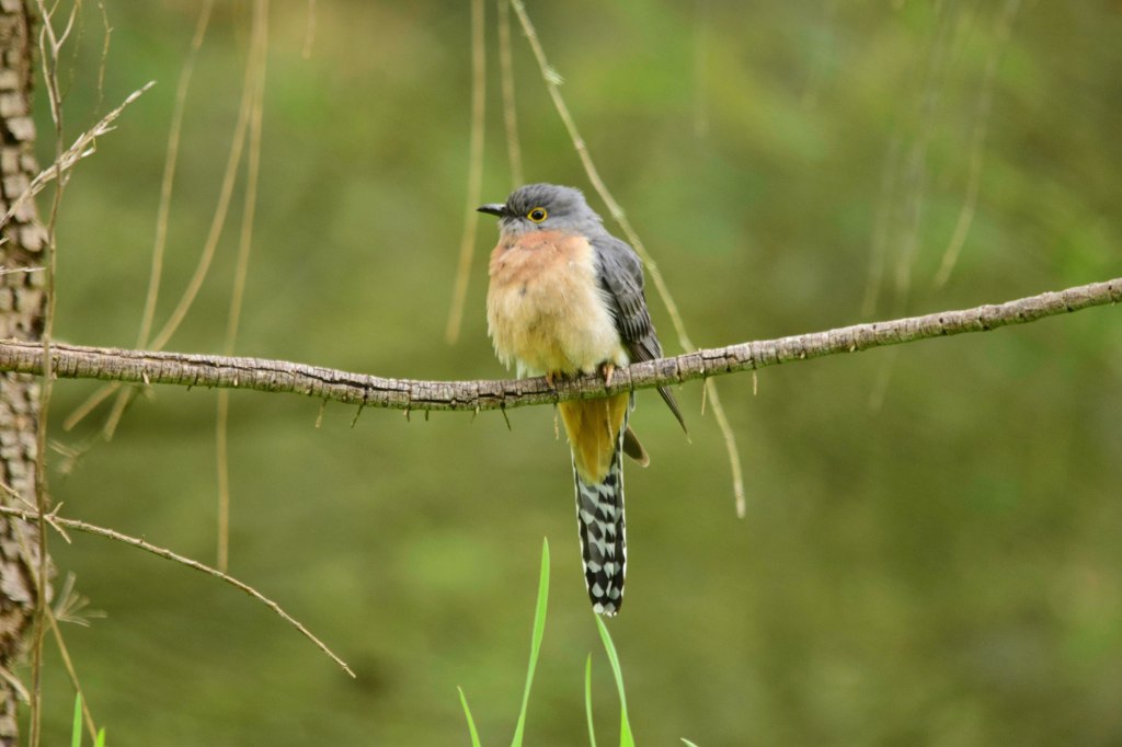 Fan-tailed Cuckoo – A migratory species to this area in early Spring. This pretty looking bird actually lays it’s egg in other birds nests, usually Thornbills and Scrubwrens. The Cuckoo egg generally hatches sooner and the chick instinctively goes to work getting rid of any rival eggs or chicks causing the host species to rear the Cuckoo on it’s own as their own chick.