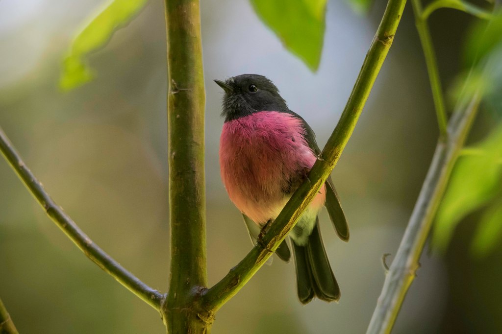 The Pink Robin – is a beautiful songbird in the Genus Petroica of Australasian Robins. Dwelling in cool temperate forests of Southeastern Australia. They draw the attention of travelling birdwatchers and local nature lovers alike as they flitter about, oblivious to their celebratory status, feeding on spiders and insects including caterpillars, beetles, wasps, flies and ants. Pictured above is the male of the species with its distinct pink breast, grey-black upperparts, wings, and tail, a little white patch on its forehead, and white undertail. The female is less striking with a mostly brown colour above, a lighter brown below, with a light pink buff breast and buff barring on the wings. Young birds are very similar in colour to the adult female, although slightly darker and more puffed-up/scruffy looking.
